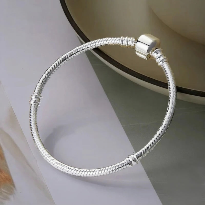 Elevate your look with the Silver Snake Chain Bracelet — crafted from 100% 925 sterling silver, this 3mm snake charm bangle is clean, elegant, and timeless. Perfect for wearing solo or stacked, it easily transitions from casual daytime wear to sparkling evening style with your favorite charms.